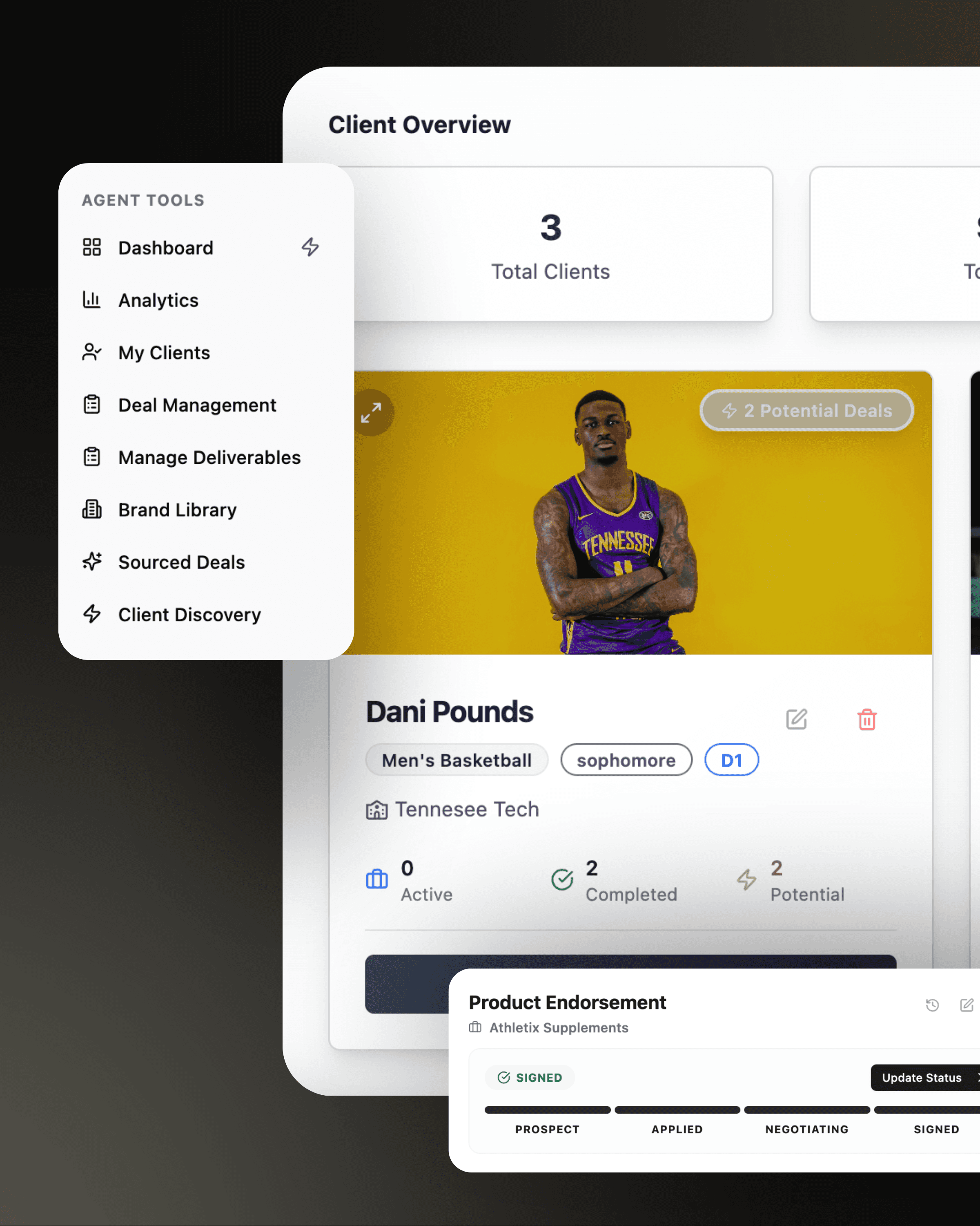 Manage athletes, staff, deliverables, pipelines, and brand relationships with tools built for modern NIL agencies.