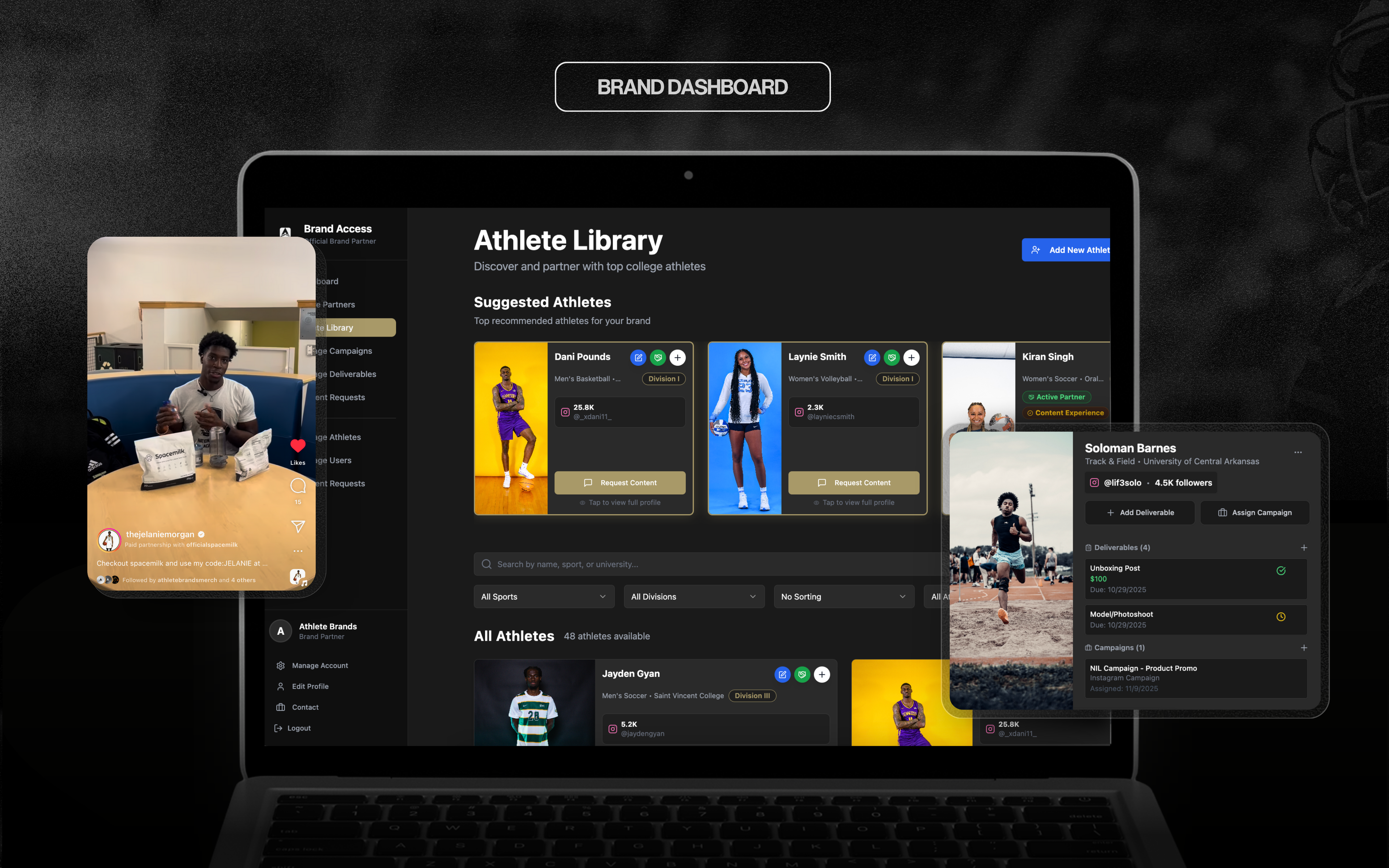 Our platform connects your brand with verified athletes who align with your values, audience, and goals. You can browse athlete profiles, send offers, manage deliverables, and track performance — all in one place.