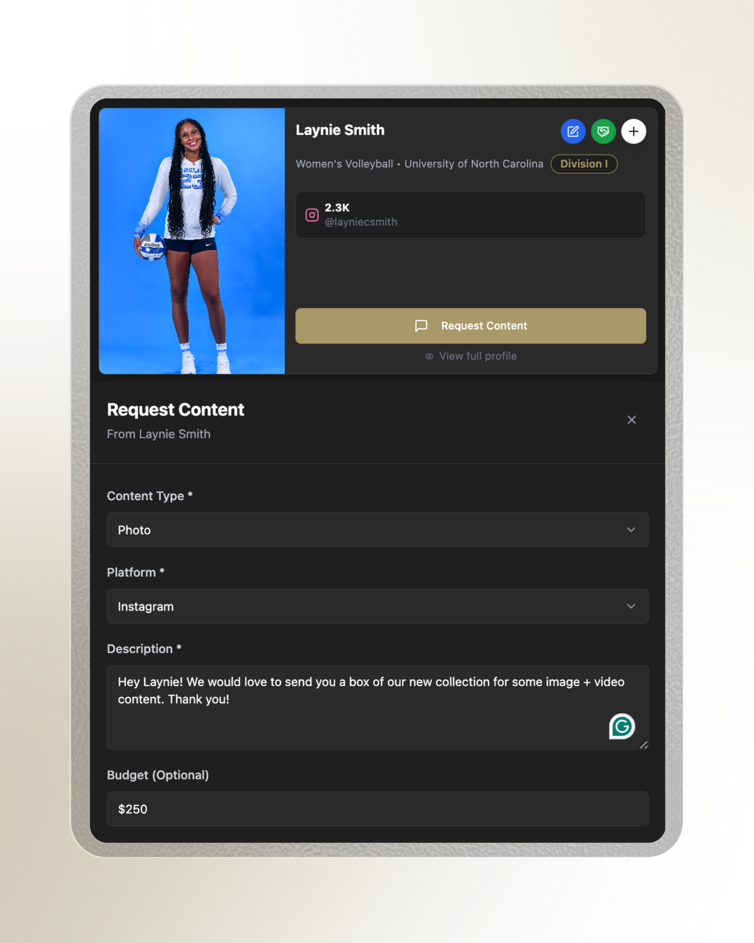 We work with collegiate, high school, and professional athletes across every major sport. Whether you’re looking for wide audience reach or authentic micro-influence, our athlete library helps you find the right fit.