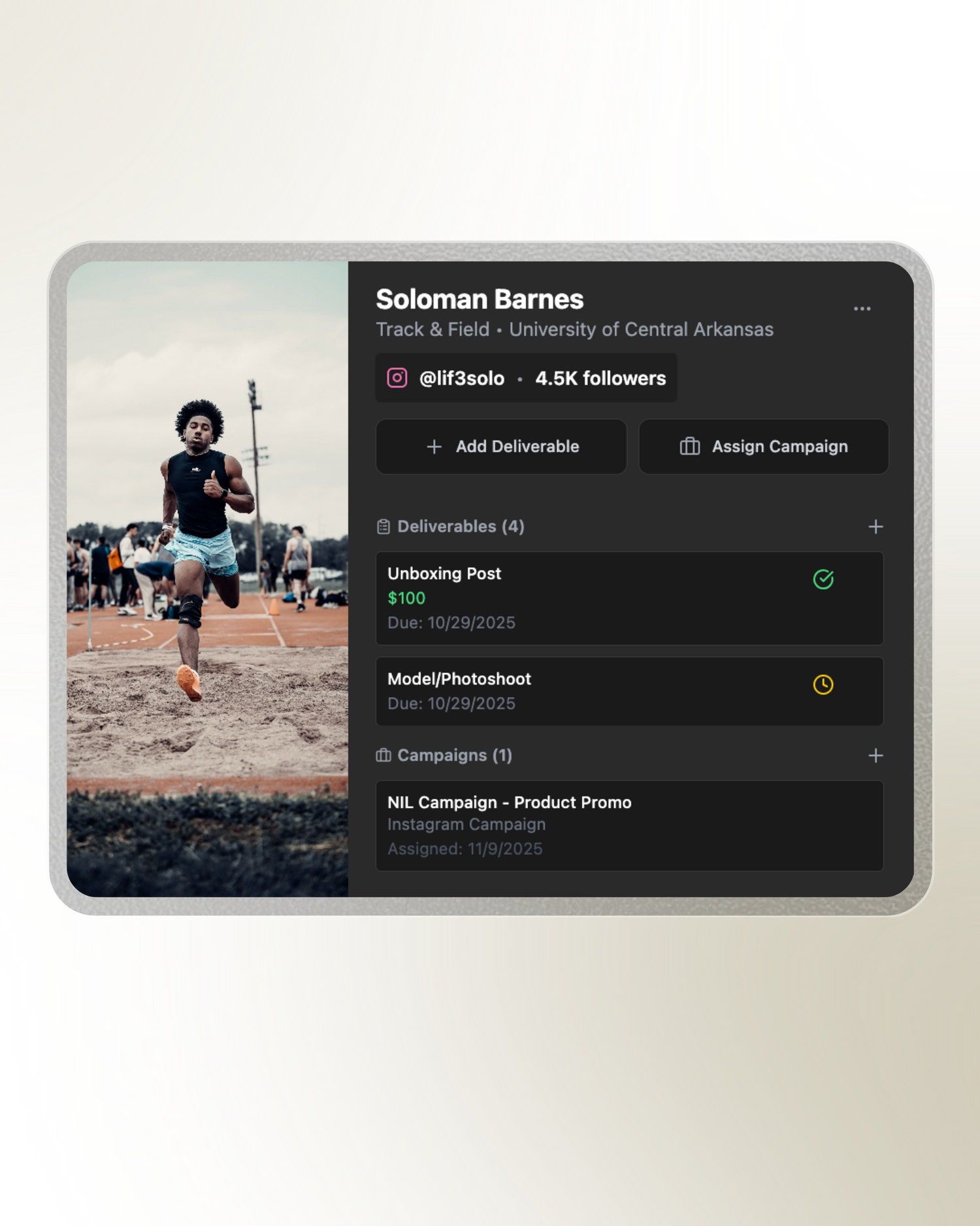 From outreach to activation, manage every athlete collaboration, deliverable, and result through one connected system — saving time and eliminating guesswork.