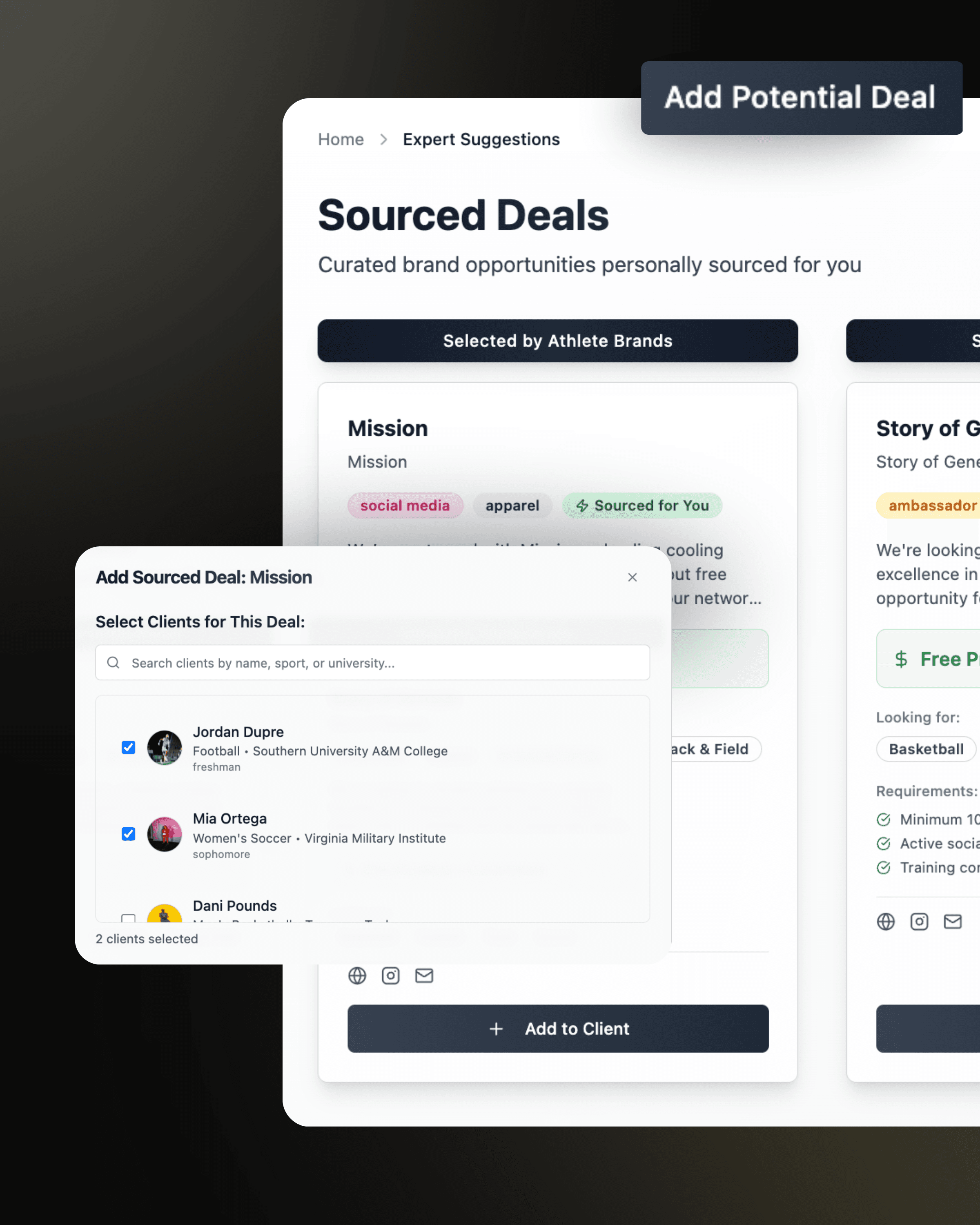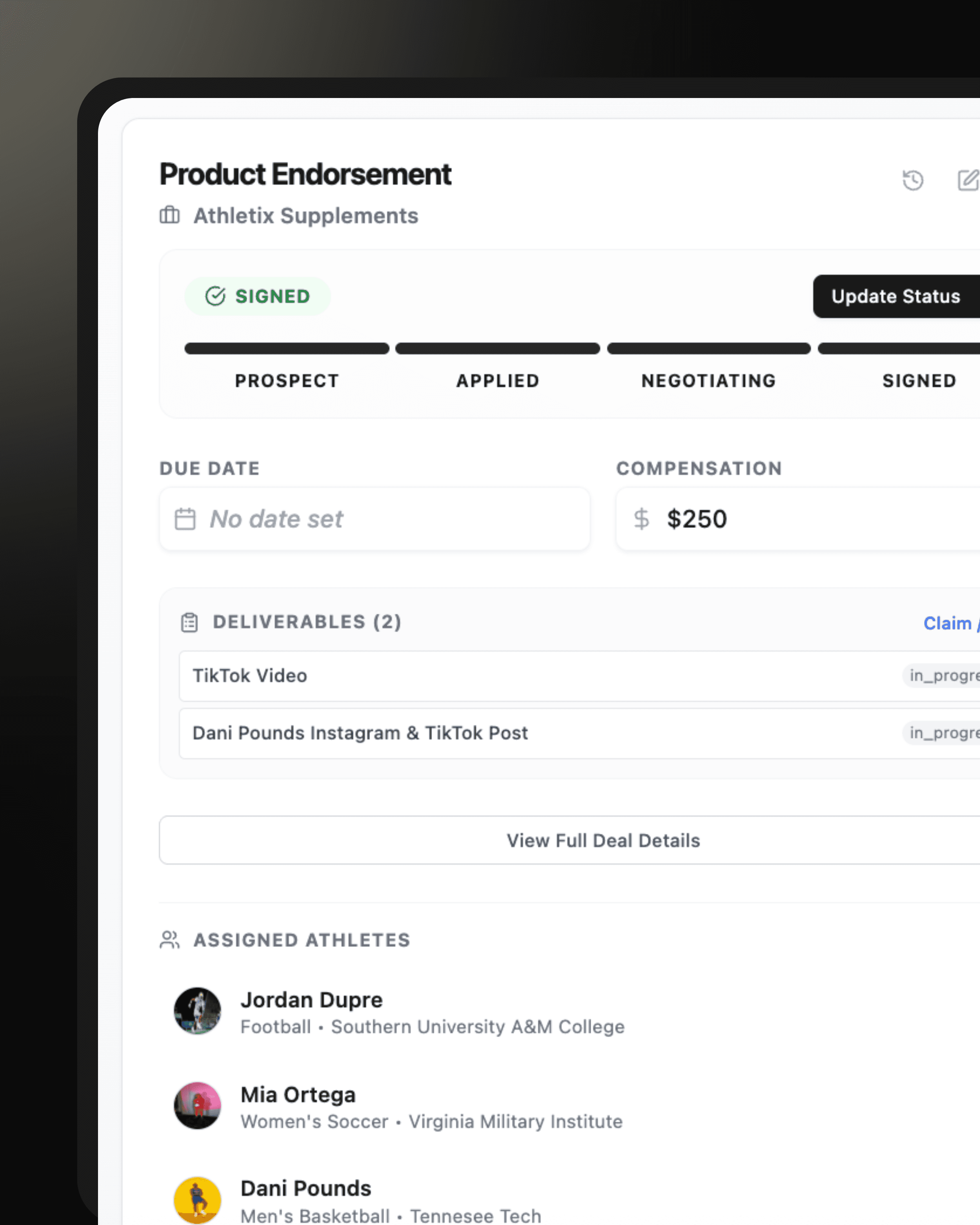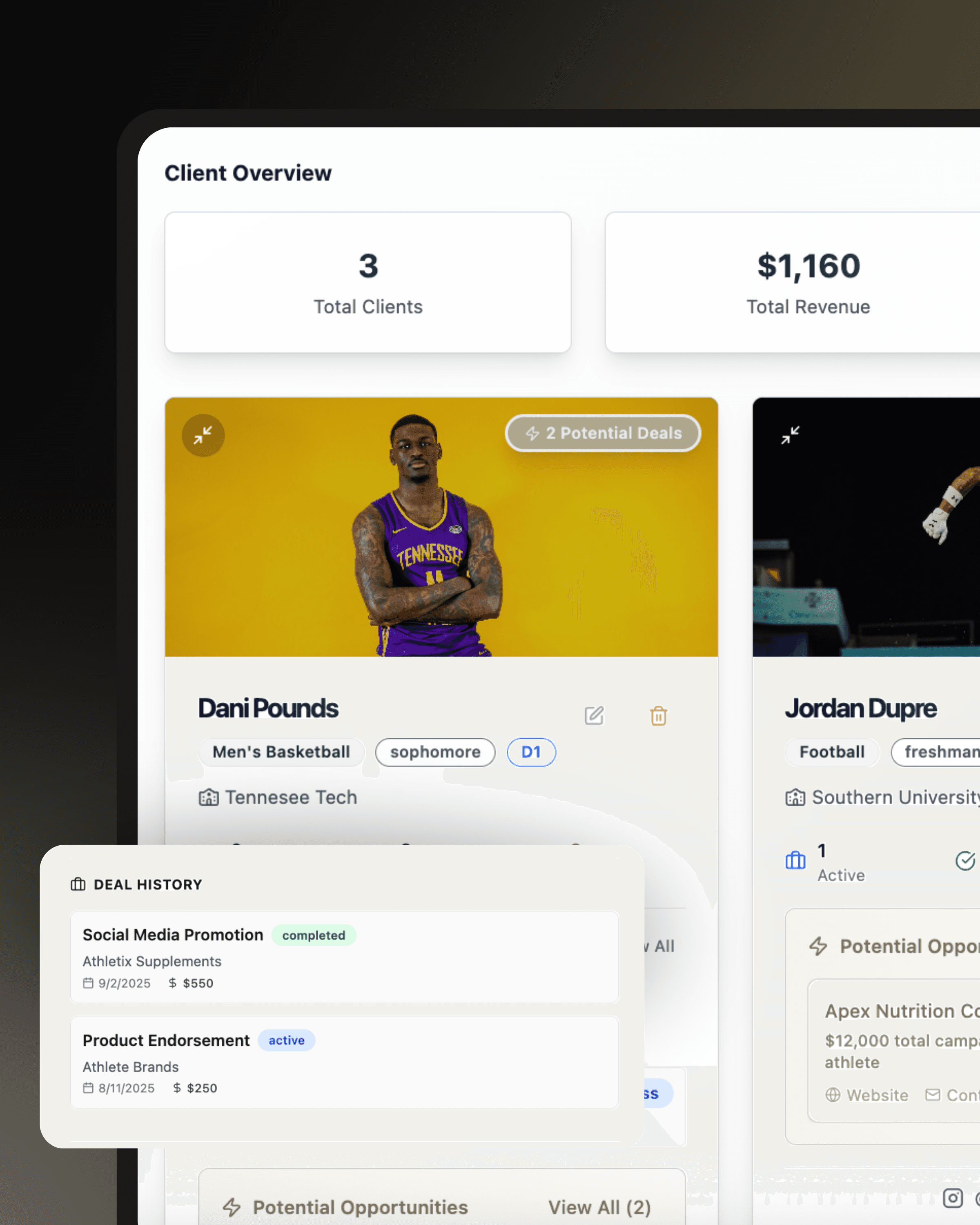 The system centralizes all client information, campaigns, deliverables, and communications, giving agencies a clear view of every athlete at once. This helps streamline operations, reduce manual tasks, and maintain organization as your roster expands.