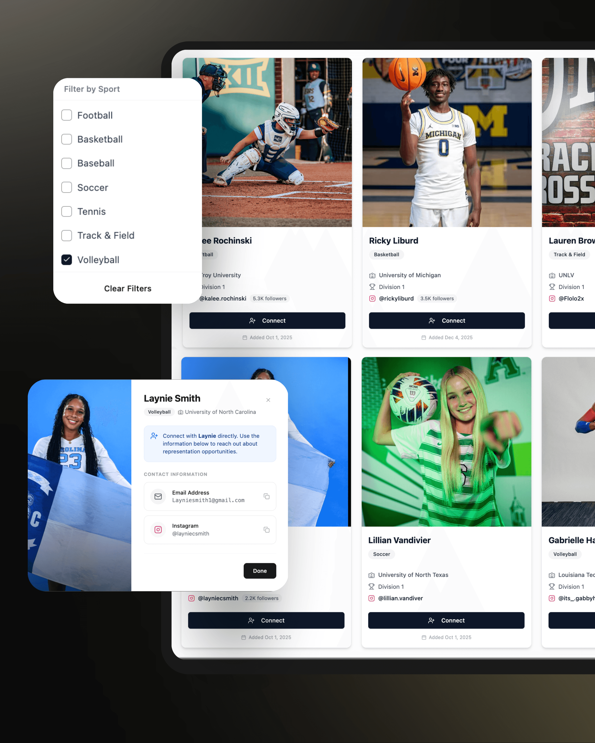 Find and connect with athletes looking for representation. Filter by sport, level, following, goals, and NIL readiness to build your roster strategically.