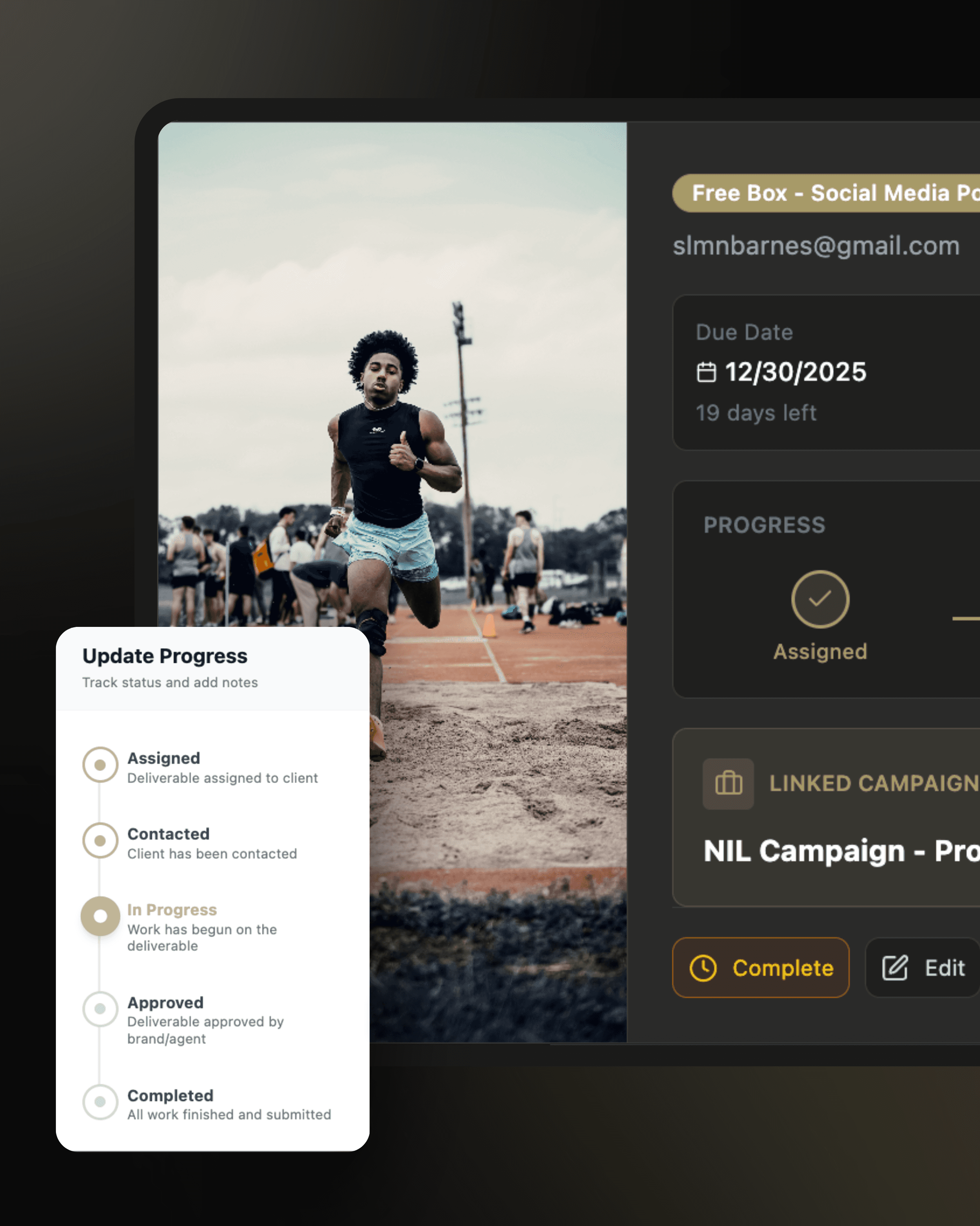 Manage every athlete, campaign, deliverable, and brand relationship from one organized dashboard designed for clarity and efficiency.