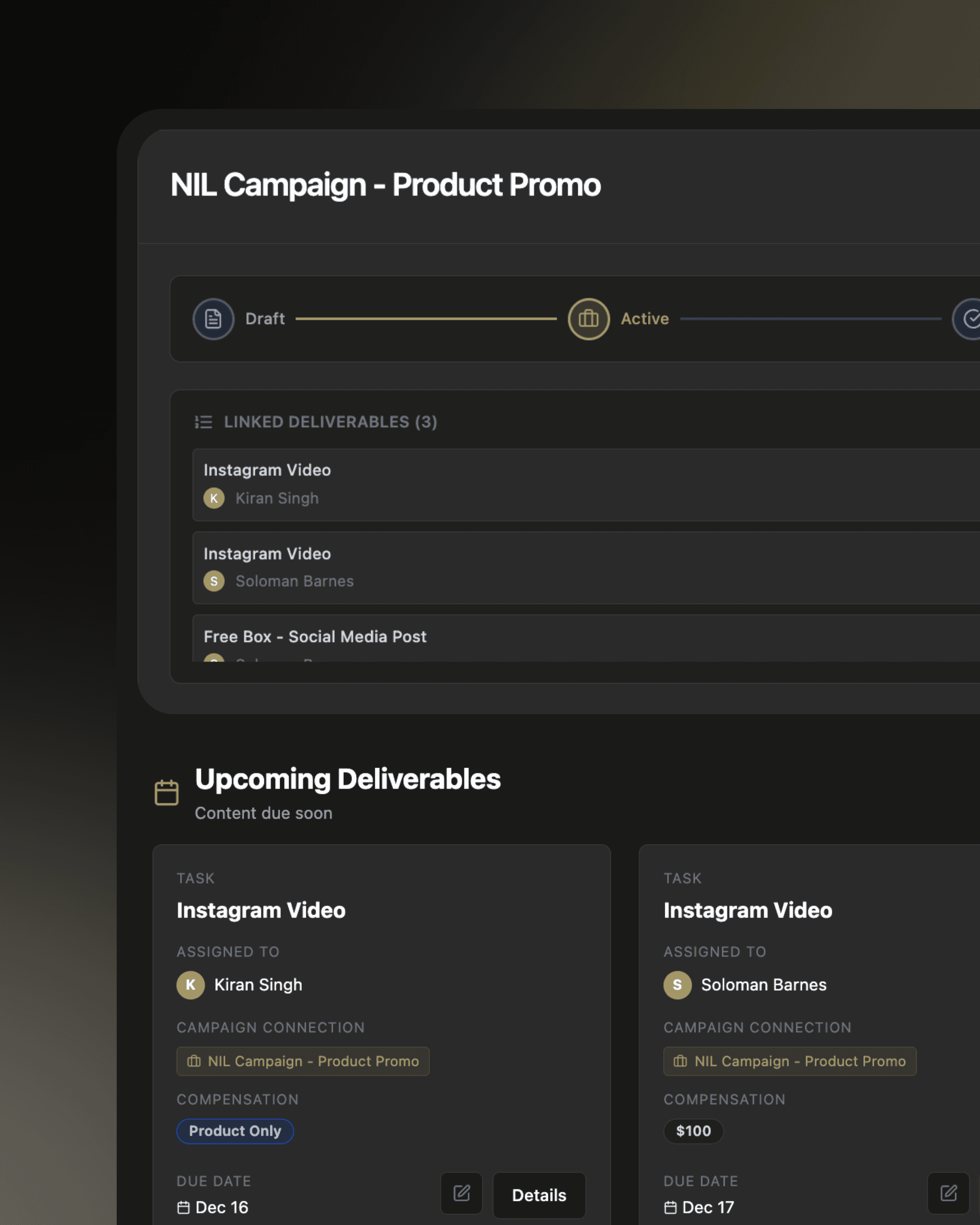 one simple dashboardManage every athlete, campaign, deliverable, and brand relationship from one organized dashboard designed for clarity and efficiency.