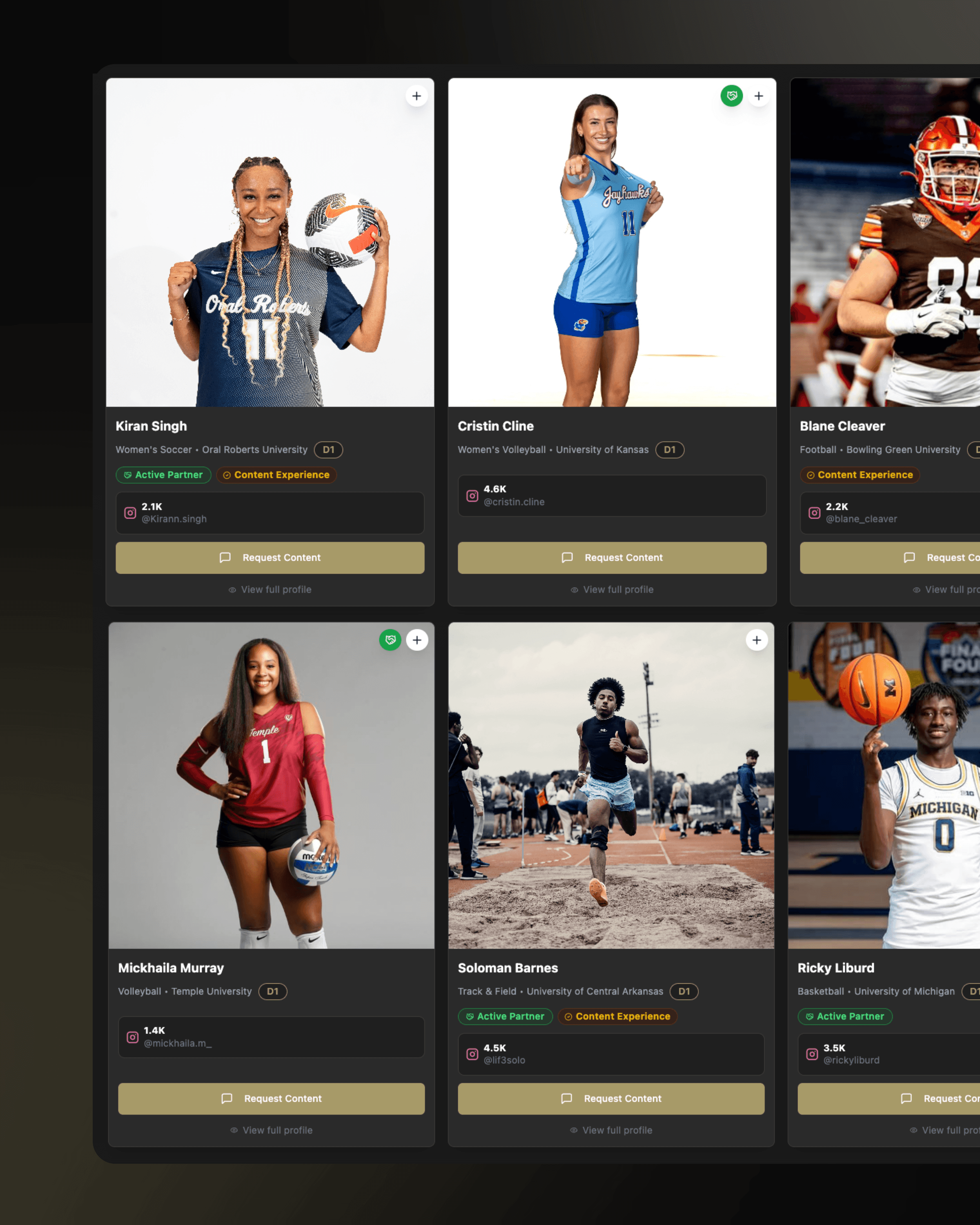 Unlock access to a growing network of verified athletes who match your brand’s audience and creative needs. Discover creators with authentic influence, browse profiles, and connect directly with athletes ready to produce high-performing content and NIL partnerships.